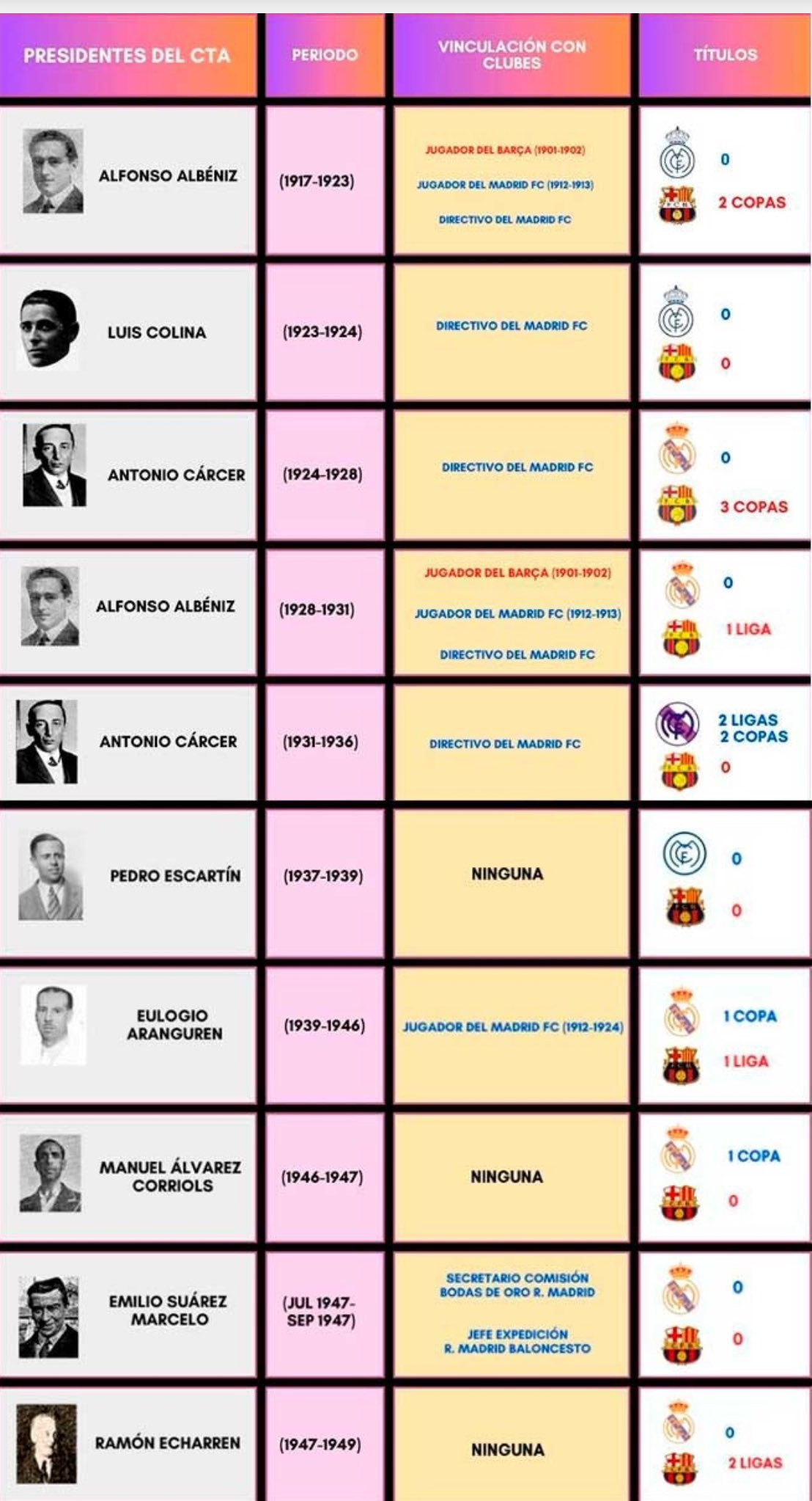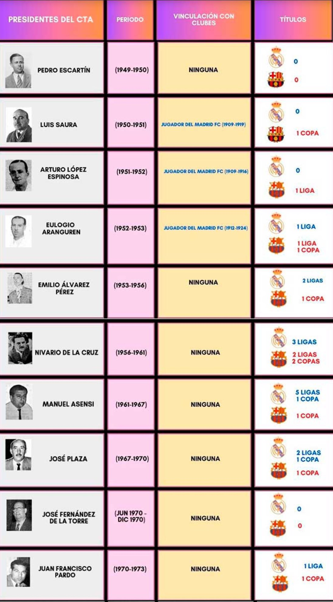 El último presidente del CTA vinculado al Real Madrid fue Eulogio Aranguren, en 1953. Aranguren, exjugador del club blanco, desarrolló posteriormente una trayectoria federativa sin polémicas. Antes de él, encontramos a otros presidentes con pasado madridista, como Arturo López Espinosa, Luis Saura o Emilio Suárez Marcelo, pero durante sus respectivas presidencias fue el Barcelona quien conquistó más títulos que el Real Madrid.Conviene recordar que, entre 1939 y 1953, el conjunto blanco solo ganó dos Copas y ninguna Liga.