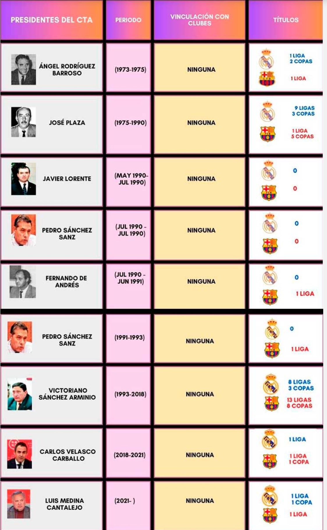 El último caso en el que el Real Madrid obtuvo más títulos que el Barça bajo un presidente del CTA con pasado madridista fue durante la Segunda República (1931-1936), con Antonio Cárcer al frente del comité. Aun así, el contexto histórico y deportivo era muy distinto, anterior a la profesionalización del arbitraje y al posterior dominio europeo del club blanco.