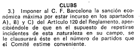 Sorprendentemente, y pese al lanzamiento masivo de objetos, la invasión de campo, el botellazo y otros graves incidentes, el Camp Nou eludió el cierre de sus instalaciones. La sanción se limitó a una multa de 90.000 pesetas y, además, se archivó la denuncia contra el presidente de la entidad azulgrana.