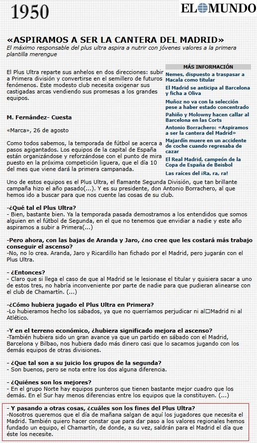Entrevista concedida al diario Marca y posteriormente recogida por El Mundo. En 1950, el entonces presidente del Plus Ultra afirmaba que su intención era “aspirar a ser la cantera del Madrid”.