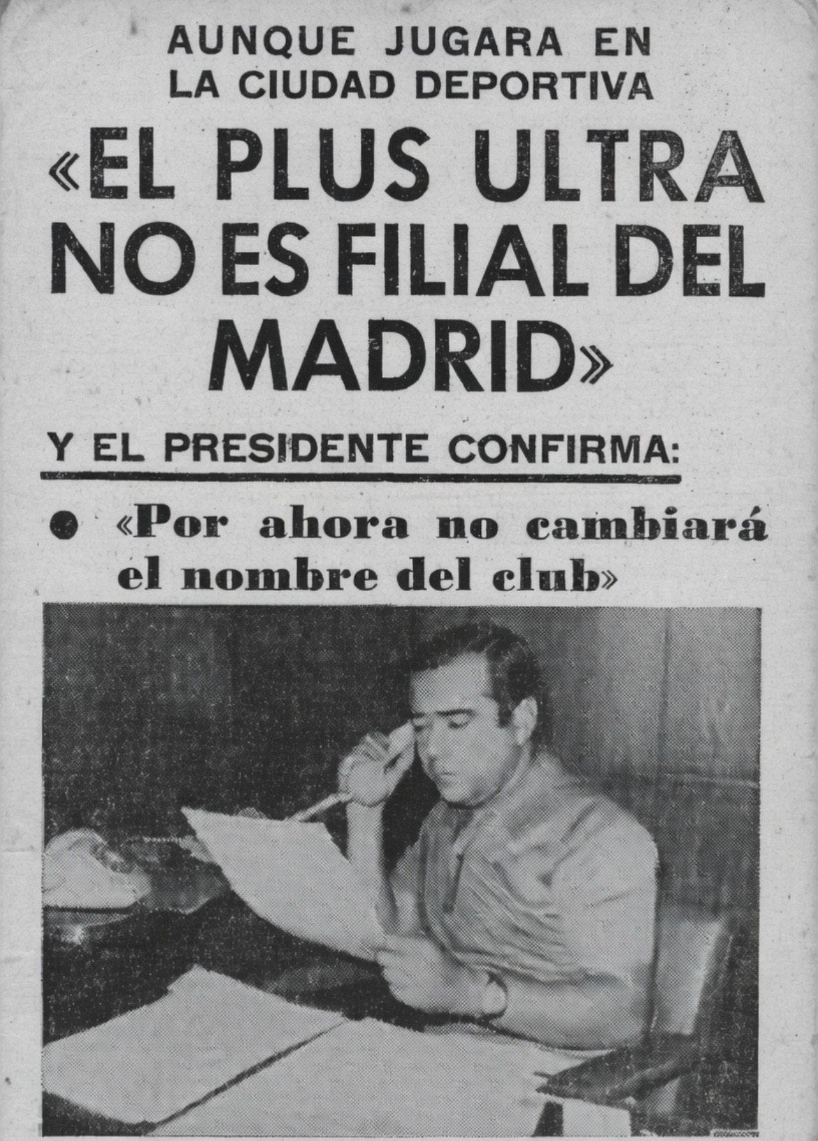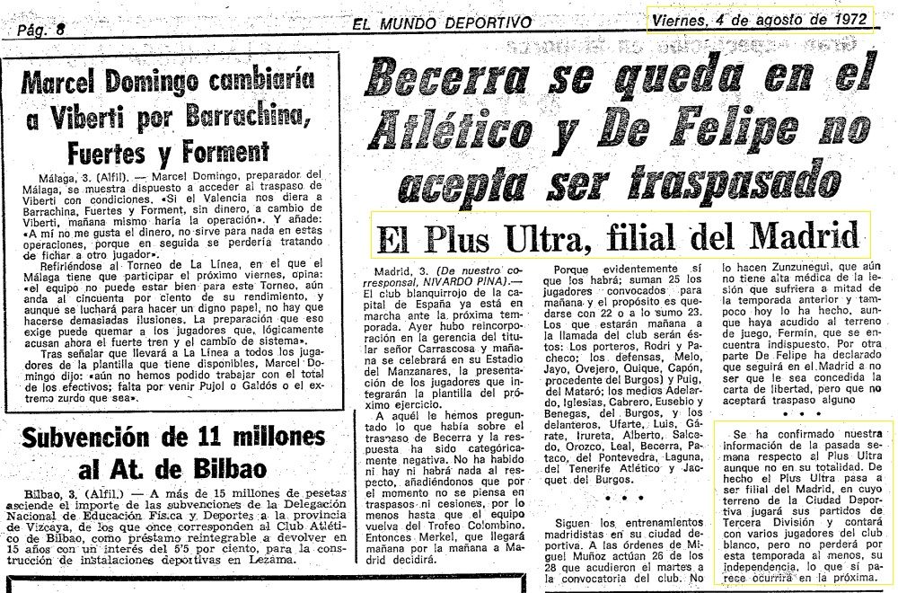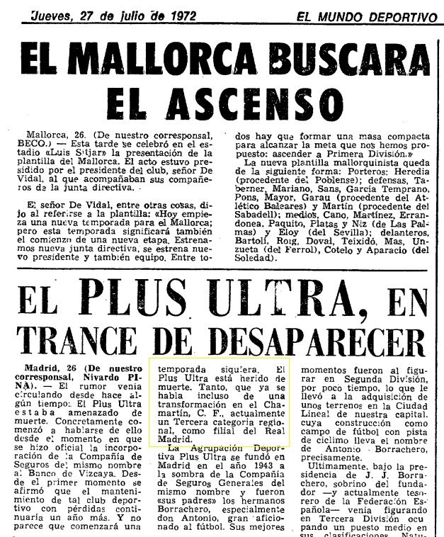 Otra información publicada por Mundo Deportivo en julio de 1972 mencionaba los problemas económicos del Plus Ultra y la posibilidad de una transformación del club en el Chamartín C.F., que sí era el filial del Real Madrid.