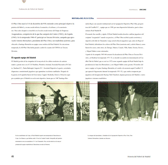 “Después de la guerra civil española fueron la Ferroviaria, Coppel, Mediodía, Girod y Cifesa los equipos ayudados por el Madrid en su devenir deportivo, hasta que en 1947 Santiago Bernabéu llegó a un acuerdo institucional con la Agrupación Deportiva Plus Ultra, progenitora del Castilla F.C., equipo que en 1990, por una disposición federativa, pasó a denominarse Real Madrid B. El acuerdo fue sencillo y rápido. El Real Madrid tendría derecho a utilizar jugadores del conjunto ‘asegurador’ cuando fuese preciso y el Plus Ultra recibiría ayuda económica y deportiva del club de Chamartín. A partir de la campaña 1963-64 comenzó la decadencia del Plus Ultra en Tercera División y, al finalizar la temporada 1971-72, se decidió su cambio de denominación al Castilla Club de Fútbol, que se creó en 1972 como segundo equipo del Real Madrid bajo la presidencia de Juan José Borrachero y con Miguel Malbo como gerente.